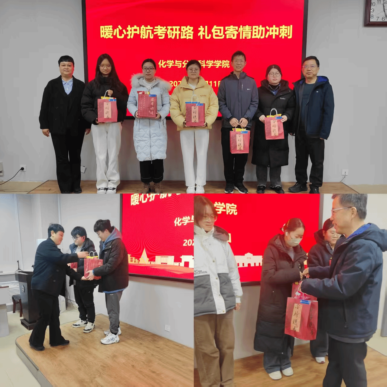 寒冬凛冽,研途滚烫;暖心护航,聚力前行。随着2025年全国硕士研究生招生考试进入最后冲刺阶段,为帮助考研学子缓解备考压力、坚定追梦信心,12月11日上午,化学与分子科学学院在226会议室开展慰问鼓励考研学生活动,并为全体备考学生送上满载关怀与期许的“备考助力包”,以实际行动为梦想续航。活动由学院党委副书记马文海主持,学院党委书记常凤香、院长陈永明、毕业年级辅导员宁攀和学院2022级近百名考研学生参加。