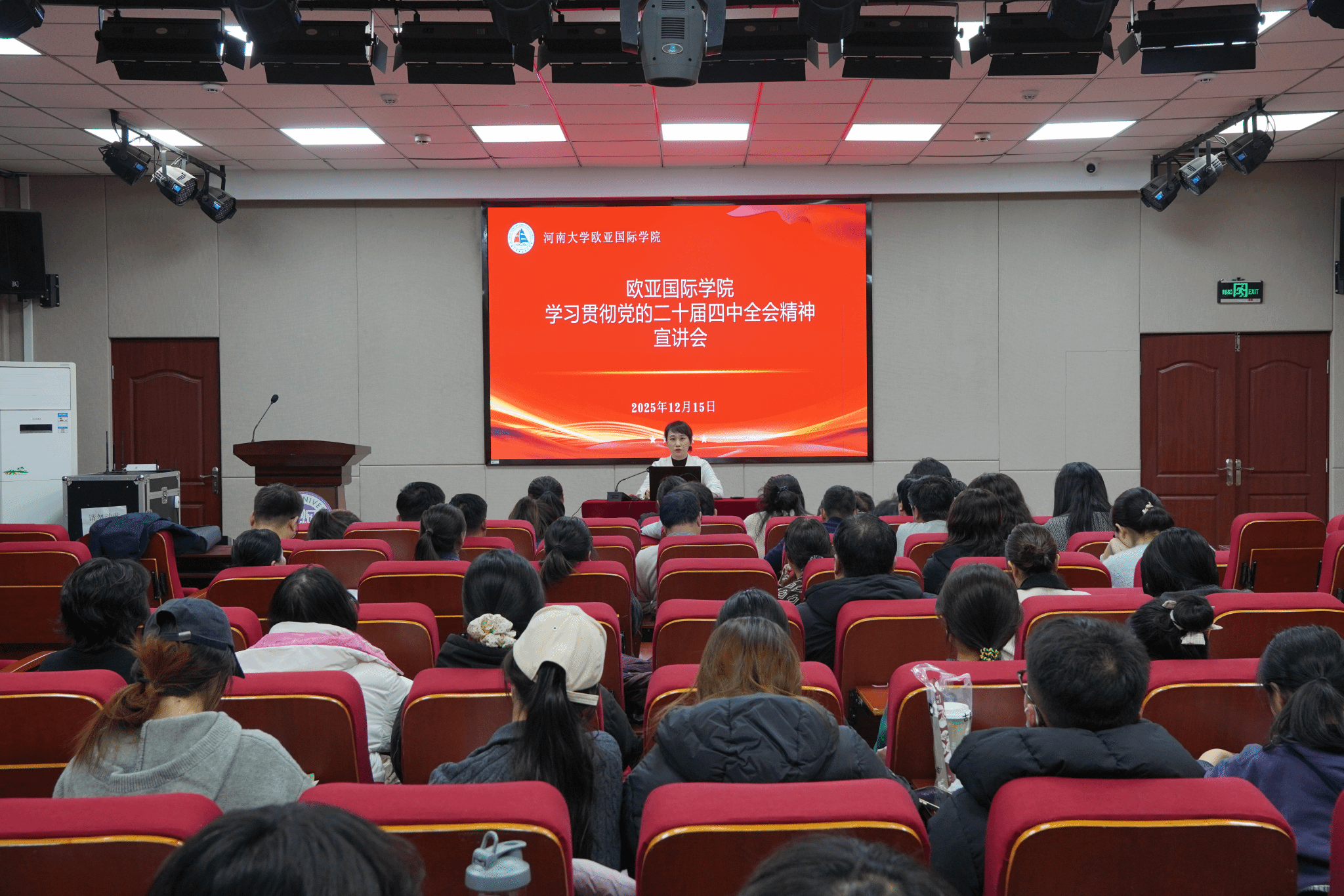 为深入学习贯彻党的二十届四中全会精神,切实把全院师生思想和行动统一到党中央决策部署及学校工作要求上来,12月15日下午,欧亚国际学院在院二楼报告厅组织开展学习贯彻党的二十届四中全会精神暨“中国共产党人精神谱系”宣讲会。学院党委书记刘佳明率先领学宣讲,河南省青年理论宣讲专家、河南大学招生办主任高冬东作专题报告,学院全体教职工及学生党员代表参加会议。会议由刘佳明主持。