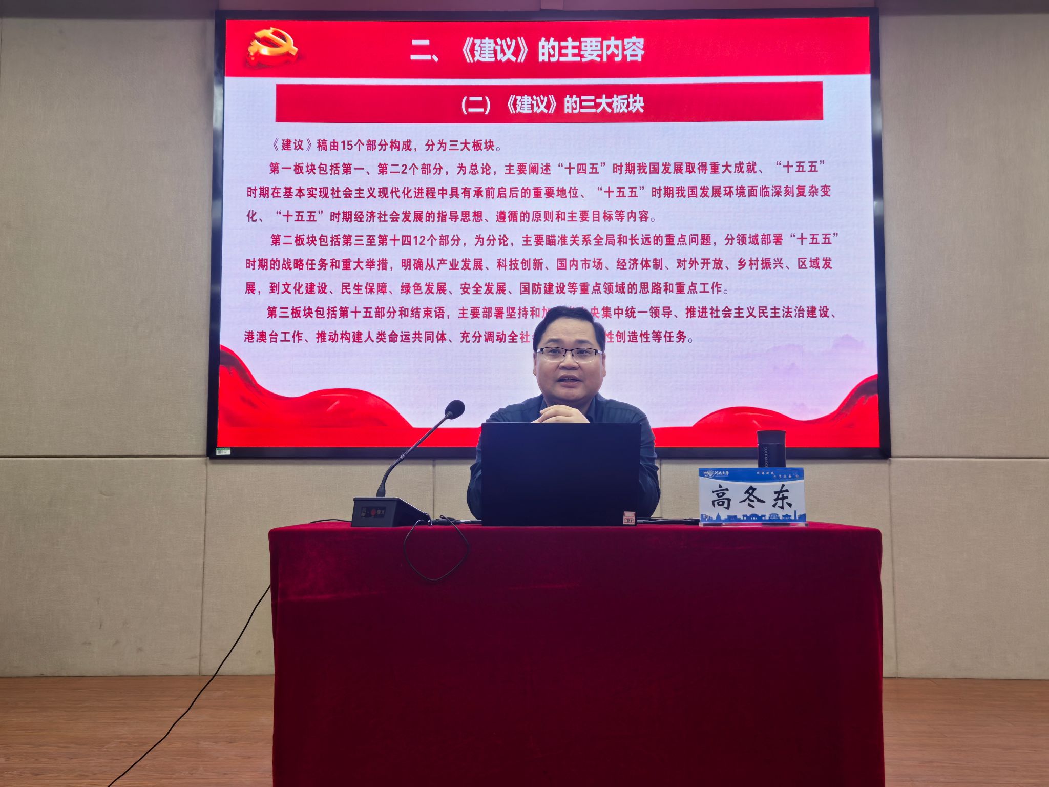 高冬东以《学习贯彻党的二十届四中全会精神》为题作专题辅导报告。报告从全会概况、《中共中央关于制定国民经济和社会发展第十五个五年规划的建议》主要内容、全会与教育相关的重点部署等方面展开;并结合“十五五”时期的战略定位、指导思想和主要目标,围绕学校发展目标,深入解读了教育强国、科技自立自强、人才自主培养等与高校发展密切相关的部署要求。