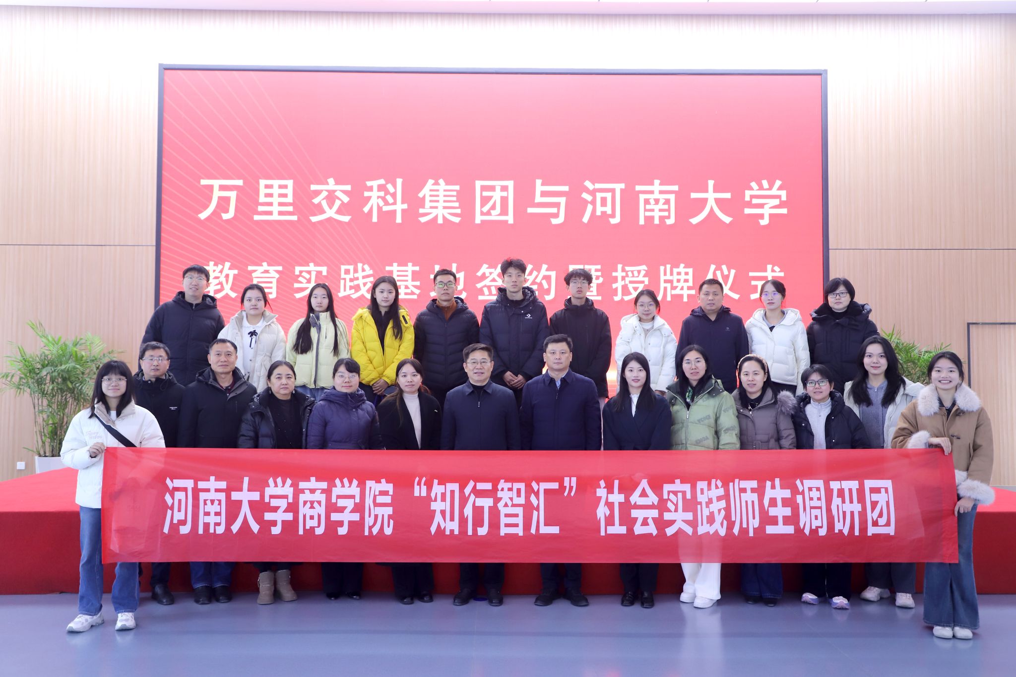 为深化校企合作,推动产教融合深入发展,1月29日上午,商学院党委书记左辞波、党委副书记马欢欢带领学院“知行智汇”社会实践师生调研团,赴许昌开展访企拓岗与寒假社会实践活动,并与河南万里交通科技集团股份有限公司签约共建本科学生实习实践教育基地,进一步拓展校企协同育人平台。