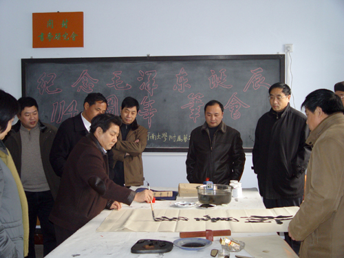 为纪念毛泽东诞辰114周年,由开封市书学研究会和河南大学艺术附中联合举办的书画笔会12月21日在艺术附中美术馆举行。开封市政协副主席、著名书法家薛文法,开封市书协名誉主席、开封书学研究会会长、著名书法家韩伟业,市美协主席、著名画家祁惠民等参加了笔会。