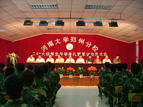 下午4点,礼堂内花团锦簇,辉煌明亮。雄壮的国歌声后,梁晓夏同志首先代表校党委、校行政表达了对新同学的祝贺和对分校职工的慰问,之后他详细介绍了河南大学和郑州分校的校史校情,对2006级新生提出殷切的期望。随后人民武装学院院长郭晓明大校作了激昂振奋的军训动员。教师代表樊立辉、在校生代表韩孜妍和新生代表李佳一也分别发言。最后,黄亚彬同志郑重地向郭晓明大校授郑州分校军训团团旗。大会在激昂的《河南大学校歌》声中落幕。