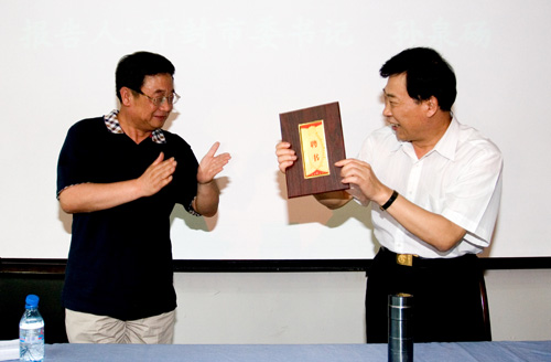 报告会由副校级调研员、校学位委员会副主席王发曾主持。报告会开始前,王发曾同志代表河南大学向孙泉砀同志颁发了河南大学兼职教授聘书。
