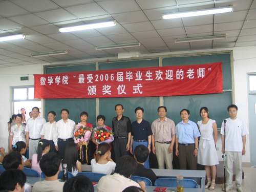 2006年6月15日下午,数学与信息科学学院隆重举行了“最受2006届毕业生欢迎的老师”的颁奖仪式,执教30余年的贾兴琴老师和年轻的博士冯淑霞老师喜获殊荣。校党委副书记黄亚彬出席并为获奖的教师颁发了奖杯和证书。宣传部、学生处、教务处等部门有关领导和该院的全体教师、2006届毕业生一起参加了颁奖仪式。