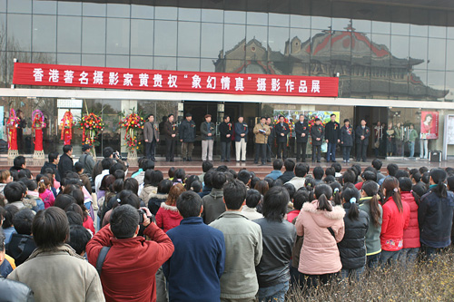 3月3日上午10时,香港著名摄影家黄贵权先生“象幻情真”作品展在艺术学院一、二楼展厅隆重展出,中国摄影家协会副主席于健、中国摄影家协会国际交流委员会副秘书长孙燕聪、河南省摄影家协会副主席张爱图、开封市艺术摄影学会名誉会长席建国、开封市副秘书长修振永、河南大学常务副校长王发曾等出席了开幕式并剪彩。此次共展出精品58幅,是黄先生用镜头对着春夏秋冬、荷与草等恬静闲适的自然环境,抓住每种生命尊严的瞬间,把线、点、色块连接起来,创造或还原了一个个人们记忆中或幻想中田园牧歌似的景象。给观者提供了意味深长的浪漫叙述。