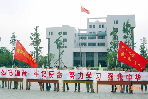 一位工作人员告诉记者:“我们本次活动的目的是为了响应学校开展的爱国荣校系列活动,纪念抗日战争和世界反法西斯战争胜利60周年,勿忘国耻,增进同学们的爱国热情。”