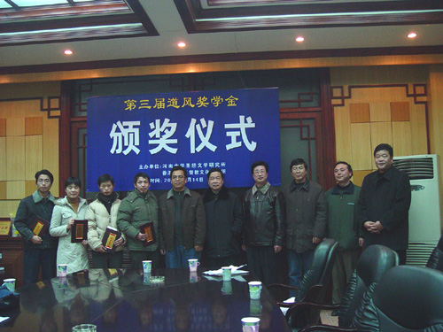 2005年1月14日晚,第三届道风奖学金颁奖仪式在河南大学新办公楼二楼会议室举行。副校长卢克平与宣传部、科研处、研究生处及文学院的有关领导以及文学院师生约30余人与会。会议由文学院赵宁副教授主持。