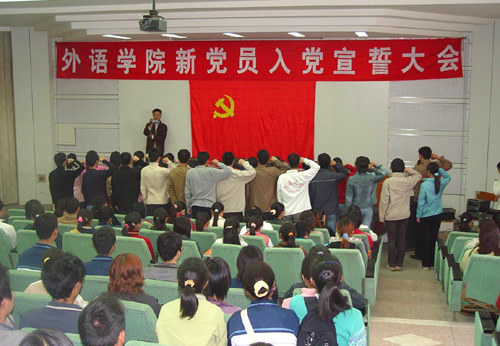 外语学院现有党员114名,入党积极分子295名,递交入党申请书的师生415名。正值全校深入学习十六届四中全会精神之际,外语学院举行新党员宣誓仪式,旨在通过这种庄严而生动的形式,组织大家学习领会党的十四届六中全会精神,对党员和入党积极分子进行党性教育,进一步增强党组织的凝聚力和战斗力,促进学院建设更好的发展。